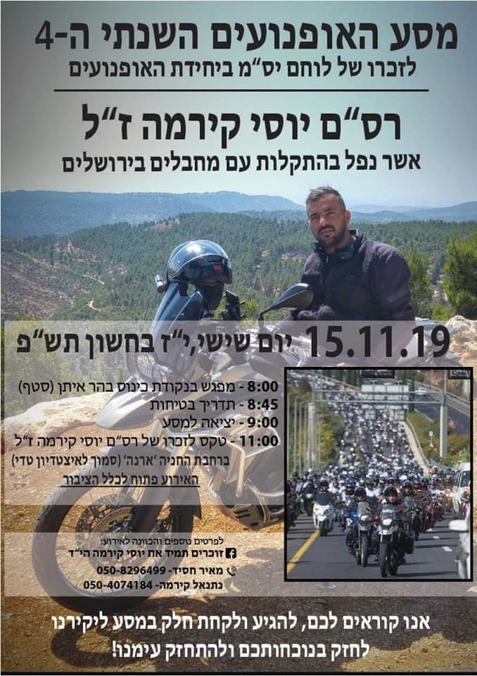 היום אחר הצהרים התקיימה פגישת עבודה של נציג מועדון האופנועים הישראלי,עם נציגי משטרת ישראל בעניין המסע לזכר רס"מ יוסי קירמה הי"ד שיתקיים ביום שישי הקרוב.