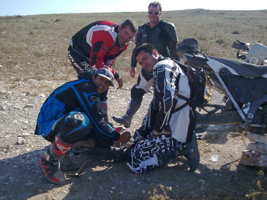 התקלה הראשונה שארעה הייתה דווקא לי. אחרי כחצי שעה נשברה תושבת ה- GPS שלי. למזלי, המכשיר עצמו נשאר תפוס בכבל ואיכשהו לא נפל והתרסק. המזל השני שלי היה שרכבנו לאט. 40-50 קמ"ש. עצרנו, שלפתי מתרמיל הציוד שלי אזיקונים חזקים, וחיזקתי את המכשיר. תוך כדי עקפו אותנו אופנועים במהירויות שקשה להאמין שבן אדם נורמלי מעז לרכב כך בתוואי שטח כזה. לאלה מכם שלא יודעים במה בדיוק מדובר, אזי במקומות שאנחנו רכבנו 40-50 קמ"ש המתחרים רכבו במהירויות פנטסטיות של 100-120 קמ"ש ואף יותר. עקפו אותנו כמו רוח.